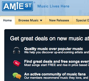 Amie Street is one of those startups that just got me – love at first site if you will. I first discovered them in 2006, calling it an awesome new music model. Artists upload songs and those songs are free to download to start. As more downloads occur the price goes up. A cent, fifty cents, etc., up to $1.