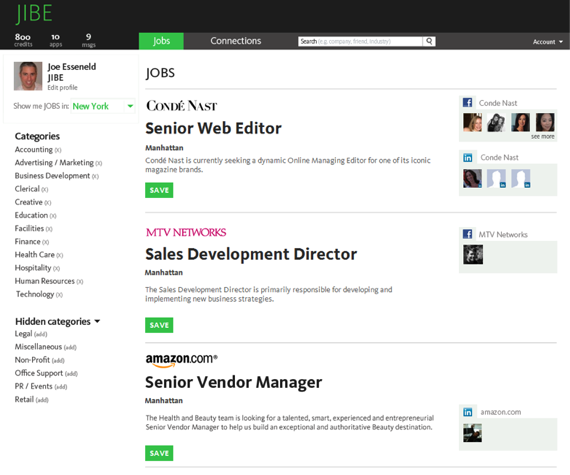 Earlier this year we wrote about TechCrunch 50 company Localbacon’s relaunch as Jibe, a next-generation job board that leverages Facebook, LinkedIn and Twitter to help job seekers find the best positions in the job market. Today, Jibe, which has been in private beta since March, is launching to the public, with job listings from Conde Nast, MTV Networks, Amazon, Equinox, and Church & Dwight.