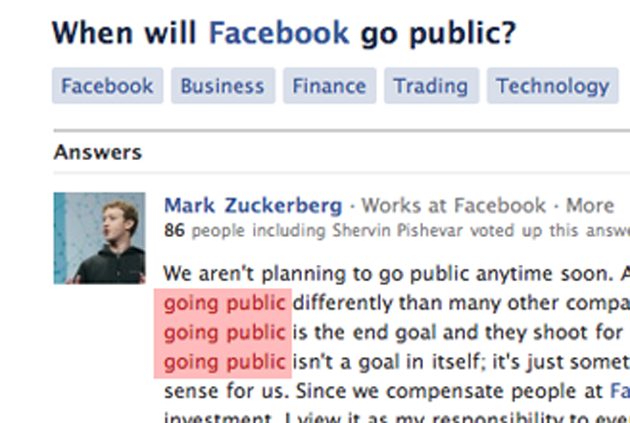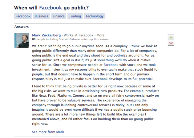 Taking a cue from Quora’s very engaged CEO Adam D’Angelo, Facebook founder Mark Zuckerberg recently used Facebook Questions to weigh in on the ETA for a possible Facebook IPO. Zuckerberg’s thoughtful take? That upcoming product developments might put a kibosh on a public offering this or next year, despite what some incoming employees may hope, “I tend to think that being private is better for us right now because of some of the big risks we want to take in developing new products.” Full text:
