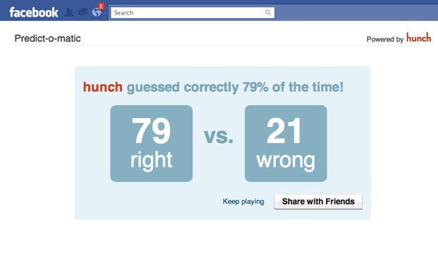 But sometimes Hunch likes to show off a little and prove that they know you even before you answer those questions. Their Twitter game was one example. Now they’ve released a Facebook game. Hunch will predict your answer to questions like whether or not you like comic books (it nailed it, I just don’t like them). And that’s without any tuning to start – Hunch just looks at your Facebook likes and makes its predictions from there.