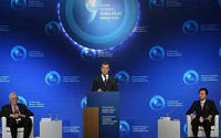 To my relief, the Russians didn’t have a dark cell in a labor camp waiting for me. But they did spring a terrifying surprise: at the last minute, Ponomarev asked me to give a talk—in the plenary session—on how Russia can build a Silicon Valley. The 500+ attendees included seven heads of state (including Silvio Berlusconi of Italy and Lee Myung-bak of Korea), two former Presidents, several finance ministers, some Russian Governors and Duma members, and, from the U.S., our Chief Technology Officer and our Ambassador to Russia. If that weren’t enough, they told me that the session was being broadcast live on two TV stations. And seated directly behind the podium where I was to deliver the speech were Presidents Mbeki of South Africa and Abdul Kalam of India, and a former vice-premier of China.