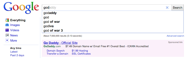When you try to do a search for “God” with the new Google Instant feature, it predicts that you’re going to type in “Godaddy” instead. If you hit a space after the “d”, it thinks you’re looking for “God of War”, the popular videogame. So the only way to actually search for “God” with this new Google Instant feature is to hit the search button.
