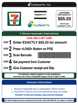 For 7-Eleven, PayNearMe is integrated with the convenience store’s point of sale and will notify payees in real-time when their consumer has paid. Merchants can also instruct PayNearMe to print custom messages on consumers’ register receipts, which can be used to print gift codes, tickets, proof of insurance, loan statements, legal disclosures, and more.
