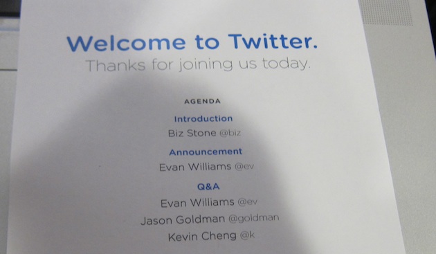 The agenda states there will be an intro by co-founder Biz Stone, an announcement by CEO Evan Williams, then a Q&A session with Williams, head of product Jason Goldman, and Kevin Cheng who is on the product team.