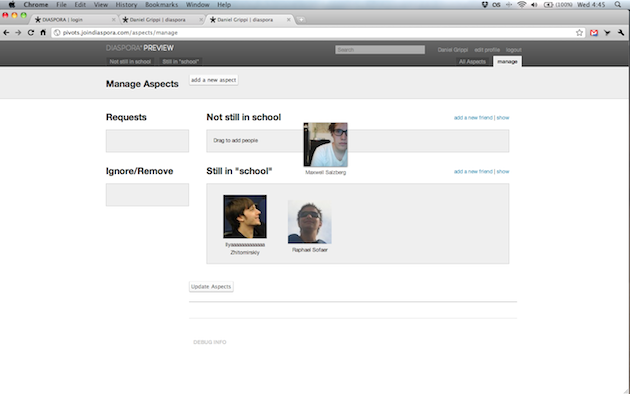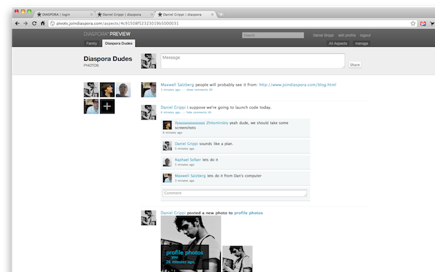 “Getting the source into the hands of developers is our first experiment in making a simple and functional tool for contextual sharing. Diaspora is in its infancy, but our initial ideas are there,” the team writes today. “Much of our focus this summer was centered around publishing content to groups of your friends, wherever their seed may live. It is by no means bug free or feature complete, but it an important step for putting us, the users, in control,” they continue.