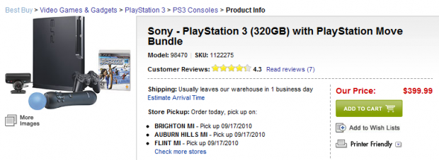 There’s no need to wait until September 19th to order your Playstation Move. Gamestop, Best Buy, and Amazon have ’em in stock and are shipping them right now. Yep, you can order both the $99.99 Starter Bundle and $399 Playstation 3 320GB with Move along with all the accessories from the major retailers. Some Best Buy stores even list the hardware as “Available Now” even though they’re not supposed to hit the shelves until the 19th. Of course when go to pick up the system, you may find a kool-aid-drinking manager standing in your way of a weekend of fun, but I’d say try anyway. You’ll get a good story to whine about on Twitter at the very least.