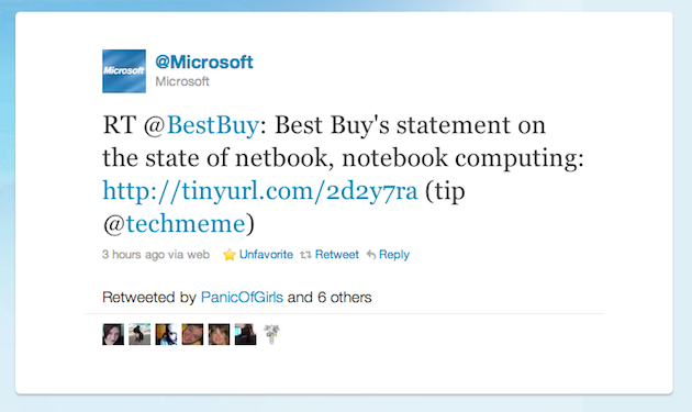 Microsoft’s official Twitter account immediately retweeted the statement and even tipped Techmeme — though someone else actually beat them to tipping Techmeme. Another Microsoft employee. Just sayin’.
