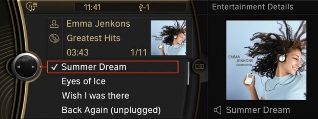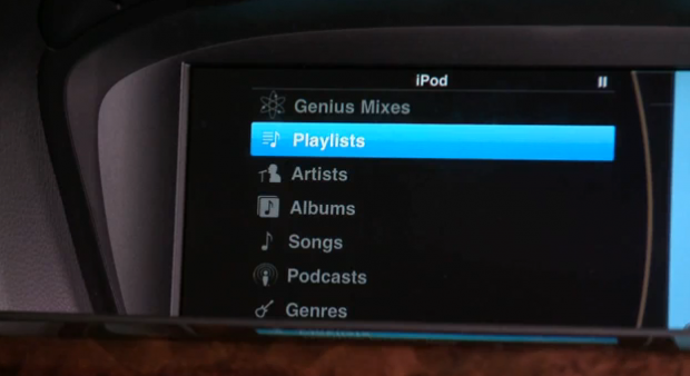 What’s cool about this is that finally we can expect the same experience in our car that we do from our phone. You can do it by connecting though the dock connector or better yet, Bluetooth — all navigated from the already in-car iDrive controller. The interface is Apple’s own, though it’s controlled from iDrive. Expect it to be similar to Front Row and to include album art.