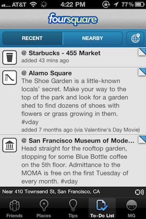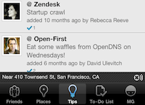 To be honest, I’m not sure these two things should be separate tabs. The old way (when they were in the same area) was also confusing, but perhaps a slight reworking of this would be better here. Maybe you have a “Friends” area for your social check-in stream, your “Profile” area, and then an “Explore” area which shows you both nearby Places and nearby Tips broken into two sub-sections. Either of these could be added do the new “To-Dos” area of the app, but in two sections: again, Places and Tips. That way you can more clearly separate actual things you want to do from simply venues you want to bookmark to go to later. And you don’t mark a venue with “I’ve done this” — you simply check-in and it gets checked off the list.