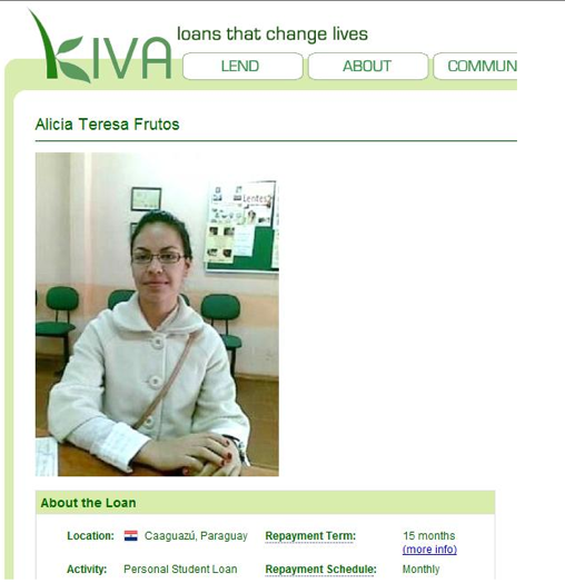 For example, Alicia Fructos, a student from Caaguazú, Paraguay is using Kiva to help fund her education (pictured below). From her lending page on Kiva’s site: