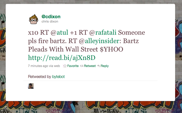 Which lead PaidContent founder Rafat Ali to call for her head on Twitter (weirdly through a retweet of a Business Insider story and not Paidcontent’s), which was retweeted by the prolific Techmeme tipper Atul Arora with a “+1,” which was then retweeted by Hunch co-founder Chris Dixon with a “X10.”