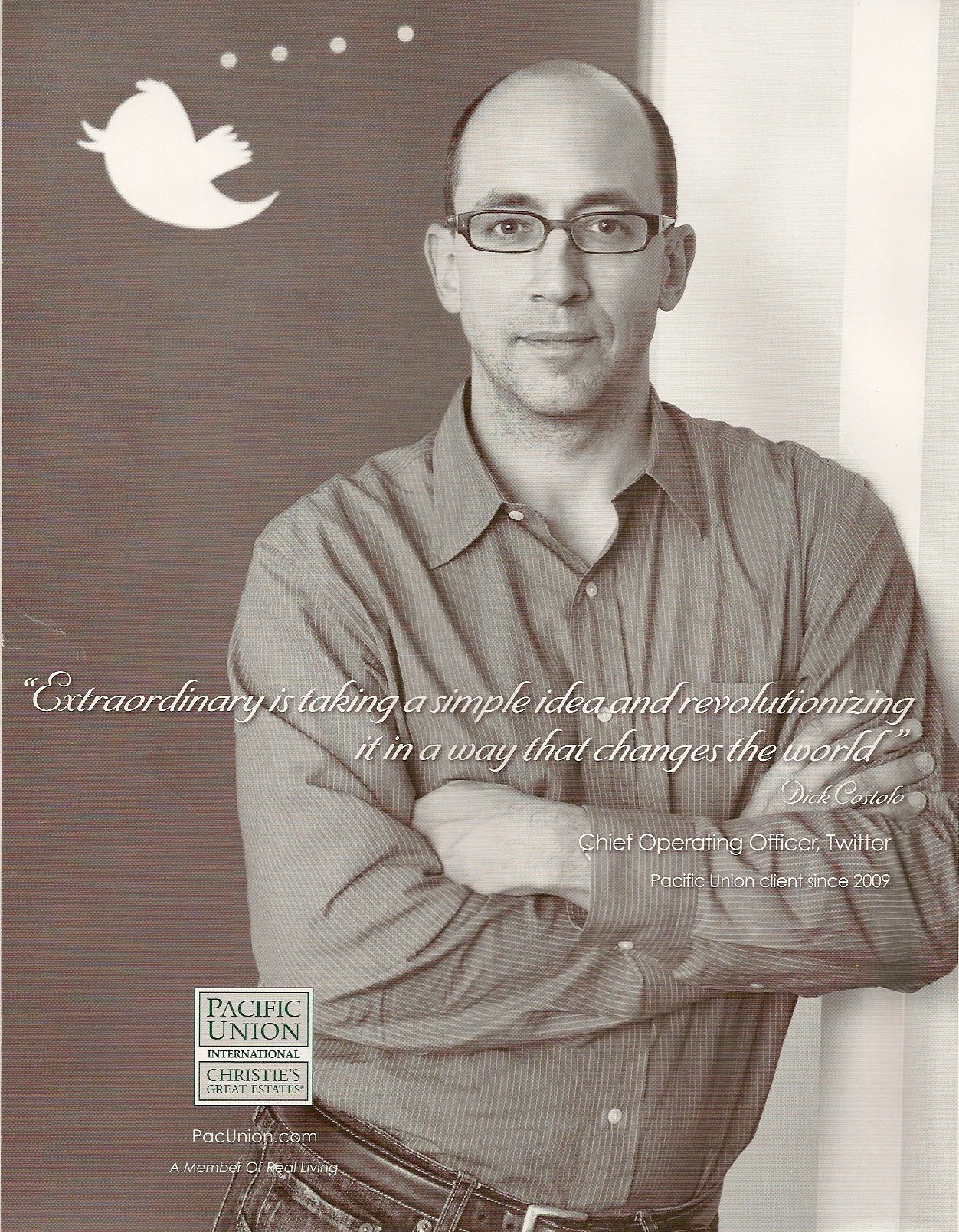 Apparently, Costolo, who relocated to the Bay Area for the job at Twitter, was so thrilled with the work of his realtors that he agreed to be in a local print ad for them with a testimonial quote that….well…if you can figure out what it means you’re ahead of me. In case you can’t read it below it says, “Extraordinary is taking a simple idea and revolutionizing it in a way that changes the world.” From what I hear, the ad has become a source of good-natured-teasing hilarity around the Twitter offices, and Costolo–not a stranger to teasing his friends— has been a good sport about it. (So far.)