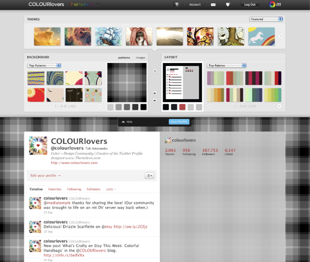 While you can access more than 1 million color palettes and 1 million Seamless Patterns created by the COLOURlovers.com community, Themeleon is also offerng ready-made themes from new partner TweetyGotBack.com (which we wrote about here).