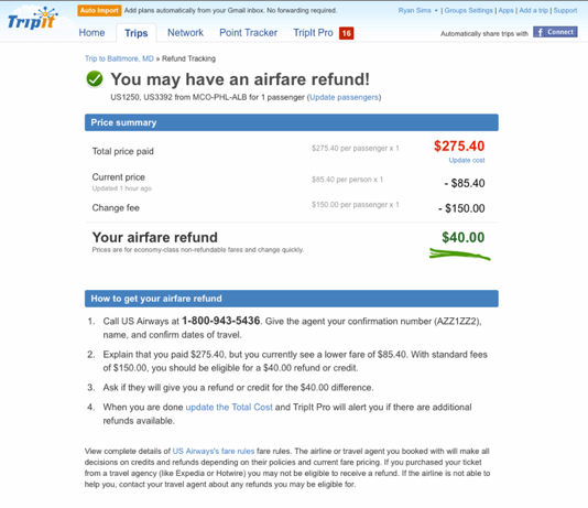 TripIt, the site that creates customized travel itineraries from travel confirmation emails, is upgrading its premium version today to be even more useful. Now TripIt Pro will track any pro member’s flight itinerary so they are notified of a price drop that could trigger a potential airline refund.