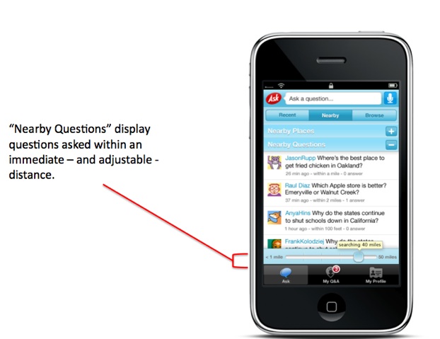 The Ask iPhone app, however, will become more interesting with its second release, which will include a feature called “Nearby Answers.” Based on your location, it will show you a list of places nearby. You can then select one of the places and ask a question about it. For instance, you can ask whether a restaurant is any good or how long the line is at the local movie theater. Your question will be routed to people nearby or people who have answered questions about those places in the past. You will also be able to see questions asked nearby, and adjust the distance from less than 1 mile to 50 miles using a slider. If you are a local know-it-all, that is a great feature. Places data is coming from CityGrid Media, which, like Ask.com, is owned by IAC.