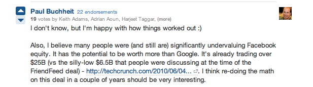 At the time of the FriendFeed deal, Facebook was valued around $6.5 billion — “silly-low“, as Buchheit puts it. Today, on SecondMarket, Facebook’s valuation is over $30 billion. This means that the roughly $30 million in Facebook stock (we’ll just say that’s accurate for now, but who knows) is worth something north of $125 million. That all of a sudden makes the FriendFeed acquisition worth something like $150 million (again, hypothetically)!