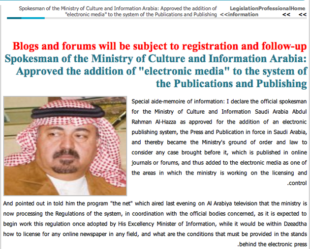 According to The Media Note, Saudi Information and Culture Ministry spokesman Abdul Rahman Al-Hazza announced last night Saudi time that all Saudi Arabian web publishers and online media, including blogs and forums, will need to be officially registered with the government.