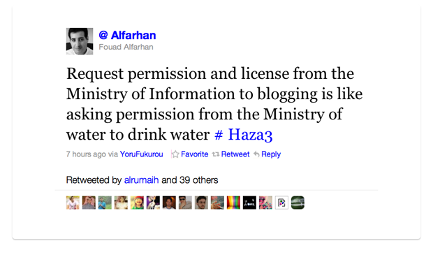 Of course this has gotten many bloggers upset, and people have taken to Twitter to protest, with the hashtag #haza3 which refers to the Ministry official’s last name. Public protesting is illegal in Saudi Arabia.