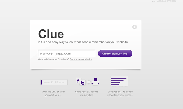 Part of the multi-product (including Bounce and Verify) website analytics ZURB platform, Clue’s objectives are simple. Similar to http://fivesecondtest.com, Clue wants to be a way for small businesses and large companies to spot and rectify immediately if there is something glaringly wrong with their websites (like the web equivalent of when you ask a friend, “Hey is there something obviously wrong about this?” and they point out a typo).