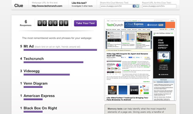 The process is such: Visit Clue, submit your URL and make a “memory test” which gives you a unique URL that you can then share with friends,a target market or control group in order to get feedback about how people initially perceive your site, giving them 5 1/2 seconds to declare their initial perceptions of your website UI via submission of the top five things they remember.