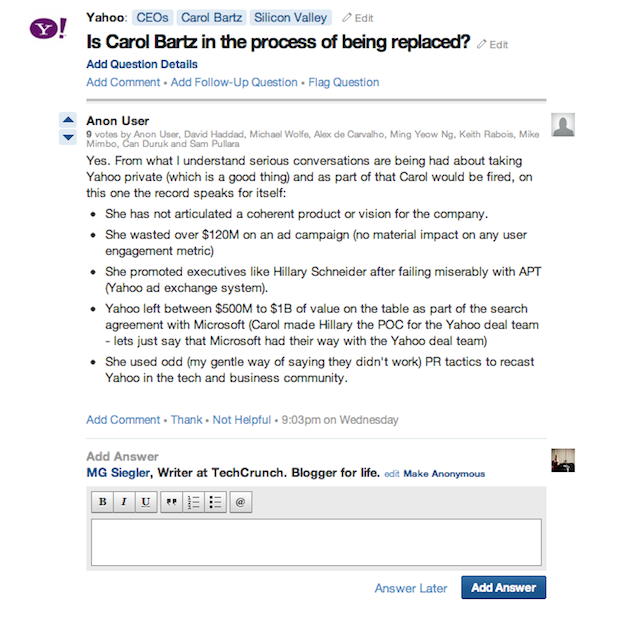 Yes. From what I understand serious conversations are being had about taking Yahoo private (which is a good thing) and as part of that Carol would be fired, on this one the record speaks for itself: