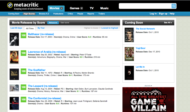 While both the Metacritic and Rotten Tomatoes sample sizes are currently small, The Social Network joins The Godfather and Lawrence of Arabia (re-release) as one of the universally highest rated movies of all time.
