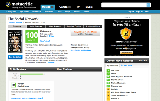 Premiering at New York Film Festival yesterday and coming to theaters October 1st, the world’s first Hollywood movie about the founding of a social network can now also claim the bragging rights of a solid 100 score on movie review aggregator Metacritic as well as a 9.9 score on Rotten Tomatoes.