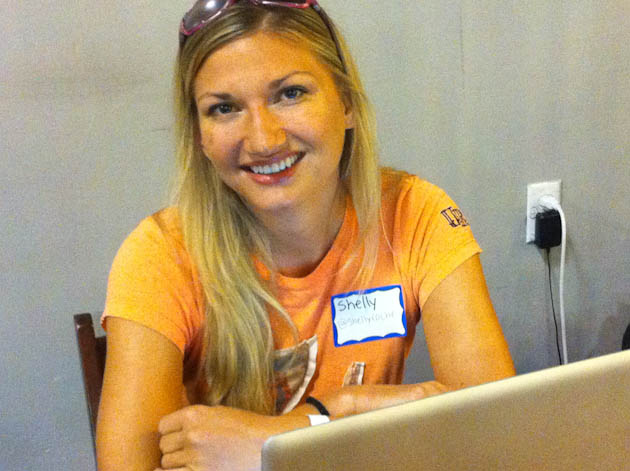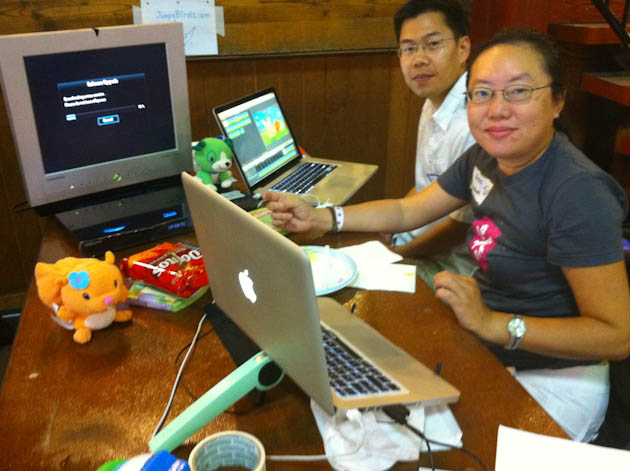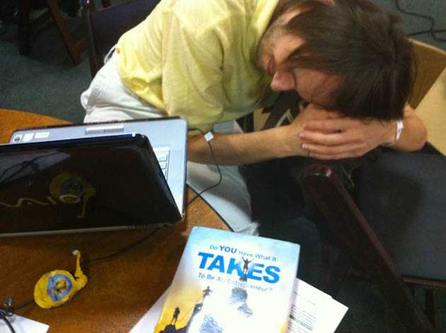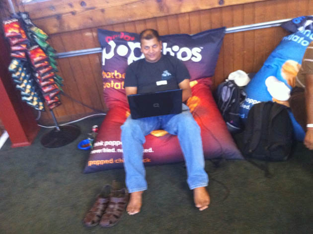 While roaming around taking pics I’ve met a slew of Groupon clones, Andrew Le Blanc, who is making an “engine to be able to see evolution happening in realtime,” Endorsey, a team working on a shopping recommendation for friends, a group working on “Pitch Hero,” a platform that allows you to get realtime feedback on your presentations, a guy building a “StumbleUpon for your Twitter stream,” and so on and so forth. TC Disrupt NY Hackathon darlings Groupme are here, sitting coding away on live size bags of Pop Chips. NYC Disrupt alums Flymodo, an app that allows you to track flights via Twitter, are also roaming the premises and were lucky enough to catch the ear of Mike Arrington himself.