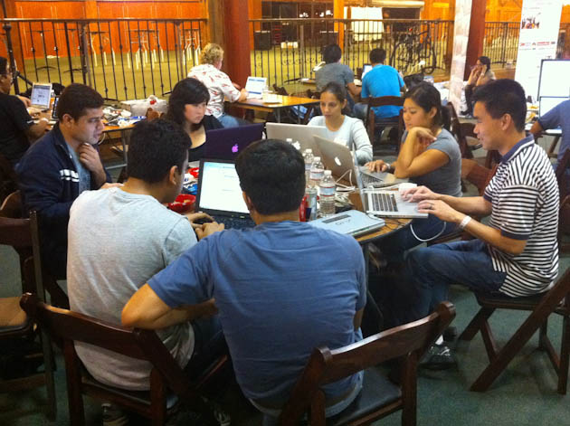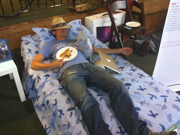 I’ve been here for about seven hours and met some great and incredibly nerdy folks. Some of us are working hard, some of us are hardly working and some of us are already asleep at 8:00 PM PST (luckily AirBnb has provided an air mattress for those brave enough to crash in front of hundreds of people). Around 400 people coders and fans of coders have shown up for TechCrunch’s Hackathon and it seems as though a good proportion have come ready to stare at their computer screens and eat carbs for about 24 hours. Aside from pizza, there’s lots of Red Bull and Diet Coke, or as I like to call it, cold carbonated coffee.