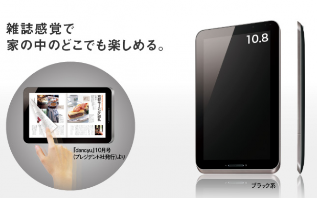 The other model, the Galapagos “home type”, misses said track ball (you’ll turn pages just like you do on the iPad). It has a 10.8-inch LCD screen (1,366 × 800) for magazine content formatted across a two-page spread. By way of comparison: The iPad has a 9.7-inch LCD screen featuring 1,024×768 resolution.