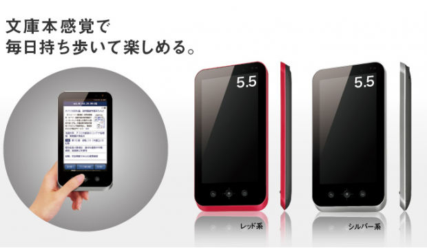 The smaller one, the “mobile type”, has a 5.5-inch LCD screen (1,024 × 600 resolution) that’s optimized for displaying paperback books (it will be available in red and black). It also comes with a trackball to scroll through pages.
