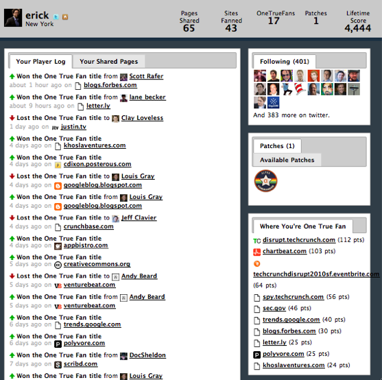 OneTrueFan is the brainchild of MyBlogLog’s founders Eric Marcoullier and Todd Sampson. MyBlogLog was acquired by Yahoo in 2007. Unsurprisingly, some of OneTrueFan’s interface is similar to MyBlogLog. OneTrueFan has raised $1.2 million in seed funding from Dave McClure, Jeff Clavier, First Round Capital, David Cohen and Bob Pasker.