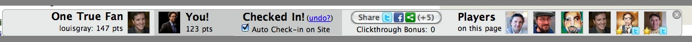 As users share more content within OneTrueFan, and on social networks like Twitter and Facebook, they can earn points, and special badges from publishers. You’ll be able to see a leaderboard of users who have been sharing content and can mouse over fellow contributors to see more information about how they’ve been interacting with a site. All of this info can be seen on the bottom of a publisher’s website.