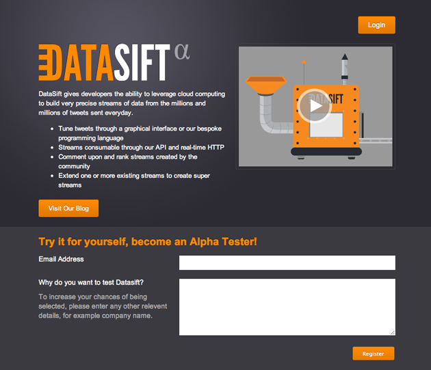 Datasift, in the same space as HootSuite and Tweetronics, is attempting to make this process of sifting through realtime data easier for companies. No longer unique to Twitter, the Datasift platform, accessible through a drag and drop graphical interface, is a curation engine which relies upon realtime filtering, providing developers with alerts, analytics and a realtime API.