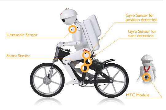 Both humanoids stands 50cm tall, weigh around 6kg, can be remote-controlled via Bluetooth or Wi-Fi, are equipped with cameras, and battery-powered. The secret for the unicycling skills lies in a sophisticated slant detection function and the balancing system placed in the chest.