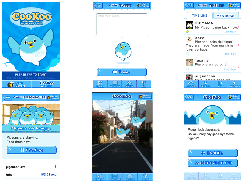 SoLAR stands for “Social, Location, Augmented Reality”. The first two SoLAR titles already added to Sekai Camera are third-party action game Kaboom and a unique Twitter app called CooKoo (Sekai Camera users can access them directly from a menu). CooKoo is a quirky mix between Twitter client and AR-powered, location-based social game that transforms your tweets into pigeons.