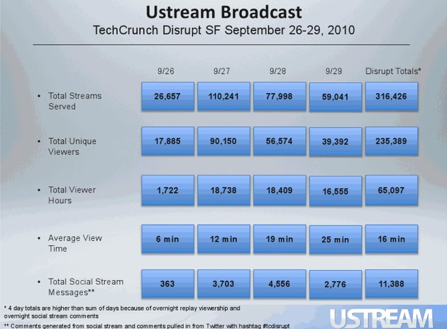 The numbers from TechCrunch Disrupt: San Francisco earlier this week are staggering. We’re still gathering the on demand view data from TechCrunchTV. But we’ve just received the high level numbers from Ustream, who powered the live stream of the event.