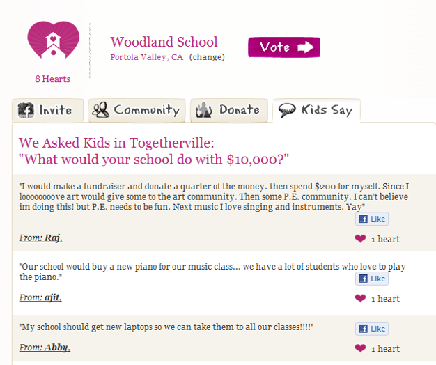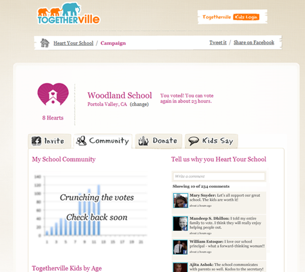 Togetherville, a Facebook-like social network for kids 10 years of age and younger, is launching a new feature called School Communities today that aims to “give kids a voice” when it comes to how their schools are run. The feature also represents a big change to the way the site is building its social graph, making it far easier for children to connect with their friends.