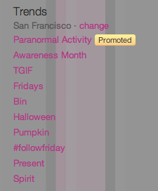 Sometime in the past few hours, Twitter made a subtle, but not insignificant change: their Promoted Trends are now appearing at the top of the Trends area on Twitter.com. Previously, these were at the bottom of the area, buried under the inevitable topics about Justin Bieber.