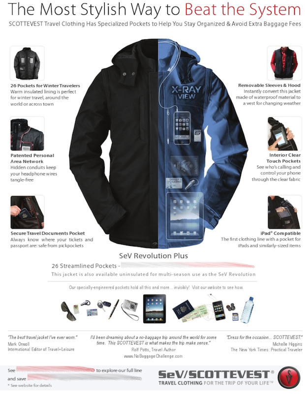 Remember back in 2008, when the airlines told us that they needed to add extra charges and fees because of rising fuel prices? Please tell me you didn’t think when fuel prices went down they’d drop those fees? It all comes down to profit, and we can definitely see that given what happened to Scott Jordan from ScottEVest. Scott makes a line of travel clothing, and in recent months has been advertising the fact that it’s easier to load up your jacket then it is to bring a carry-on. I agree, but apparently Delta doesn’t. They actually refused to run Scott’s ad, despite the fact that they charge (quite handsomely I assume) for those ads in the Delta Sky Magazine.