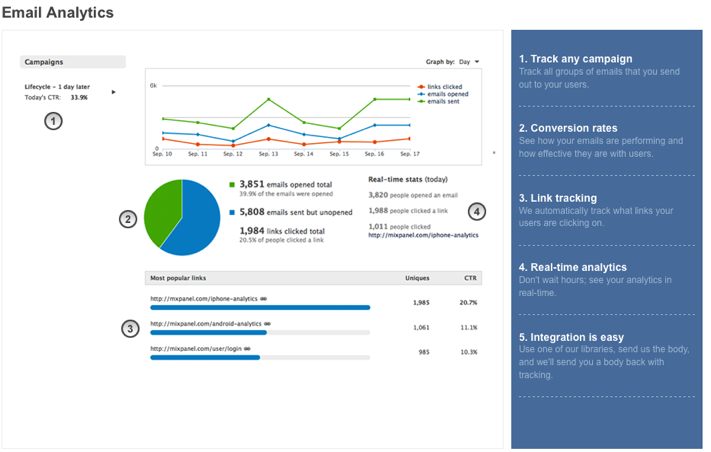 With the new email offering, Mixpanel is allowing companies who send large amounts of email correspondence (i.e. think LinkedIn, Facebook, Groupon) to track analytics around the effectiveness of these emails. Developers will be able to track click through rates for links within an email, the rate at which emails are opened, and will soon allow users to conduct A/B testing for emails. So developers will be able to test out two versions of an email and see which one receives the most interactions. Mixpanel promises realtime updates and says that stats show up in seconds.