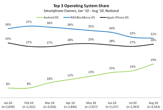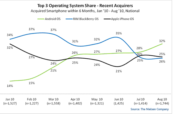According to August data from The Nielsen Company, Android has passed the iPhone and BlackBerry to become the popular operating system for people who bought a smartphone in the past six months. Over the past six months, 32 percent of new smartphone owners chose an phone with an Android operating system, while 25 percent chose the iPhone OS and 26 percent chose RIM’s Blackberry smartphones.