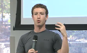 The setup for today’s event is unusual. There are a half-dozen monitors set around Facebook’s large conference room (which doubles as a cafeteria). And Facebook isn’t allowing anyone to take video footage, which I’m hearing is a first.