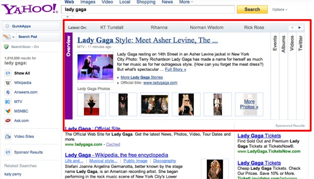 When you do a search for “Lady Gaga,” for instance, the default box is an overview with an excerpt from her bio, link to her official site, and photos, but there are also tabs for nearby events, albums, videos, and Twitter. The Twitter tab is further divided into her official Tweets, Tweets from Hollywood Insiders, and Tweets from “Everyone” (although it is not really from everyone, Yahoo filters out spam and bots).