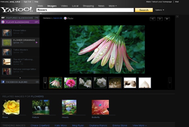 If you do a search for a trending search topic, chances are you will get a slideshow in the search box, along with photo sand information. (Yahoo loves search-generated slideshows). Yahoo is also adding slideshow results to its image search. The top result will now often show a box with related slideshows from different public domain image banks such as Flickr.