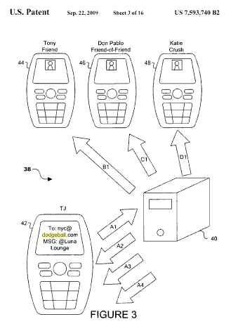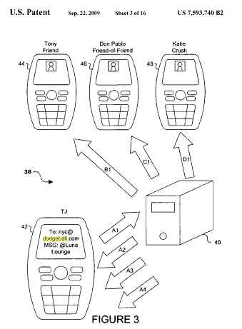 Part of the Facebook patent describes other use cases as well, such as simply showing where friends are who have checked in nearby, but that is also part of the Dodgeball patent, which includes “a message generator to prepare messages to users regarding the locations of their acquaintances if those locations are proximate to the users.” At the very least, it is a little too convenient that the Dodegball patent was not listed as prior art. Did the (probably overworked) patent examiner even consider the Dodgeball patent before he granted Facebook its patent?