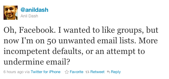 Still though, there is a real problem with Groups, and it’s spam. Once you’ve been added to a group (which doesn’t require an opt-in on your part), you’ll be sent email notifications each time one of your friends posts to that group. That could pose a problem depending on how active your friends are — our own MG Siegler says he woke up to 300 new email notifications from the feature alone. As Anil Dash wrote in one tweet this morning, “I wanted to like groups, but now I’m on 50 unwanted email lists.”