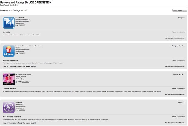 A tipster today emailed to point out that Flixster CEO Joe Greenstein gave his own app a five star rating on iTunes, and then went on to trash the competition. Both Movie Night Out and Showtimes got one stars. “It tries to do too much and fails,” he said of Movie Night Out. And Showtimes “does not include a full list of movies – just the current ones.”