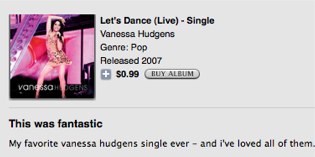 Greenstein really likes Hudgens, and gives her Let’s Dance single a four star review. It’s not the Flixster 5 stars, but it’s close. And he says “This was fantastic – My favorite vanessa hudgens single ever – and I’ve loved all of them. The rhythm, rhyme and fortuitousness of this piece is elaborate, seductive and resonates deeply. Reminiscent of past greats from chopin to bruckheimer, truly a spectacular spactacular.”