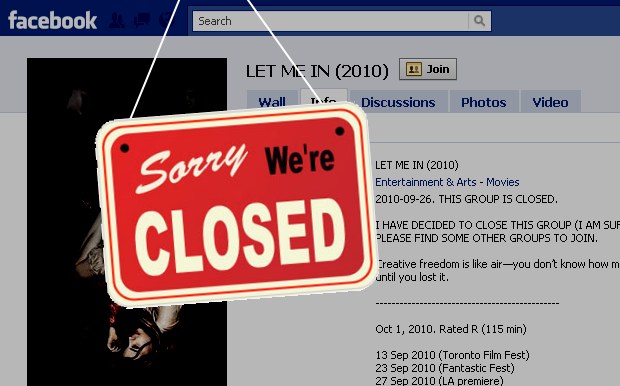 In early September, Overture Films, which is producing the US remake (Let Me In) of acclaimed Swedish vampire flick Let The Right One In, issued a DMCA takedown notice to Facebook regarding a fan group for their upcoming film. Overture (their advertiser specifically, Mammoth) had created an official page, but was bothered by the unofficial page, and demanded all their “infringing” content (links to trailers, fan art, and so on) be taken down.